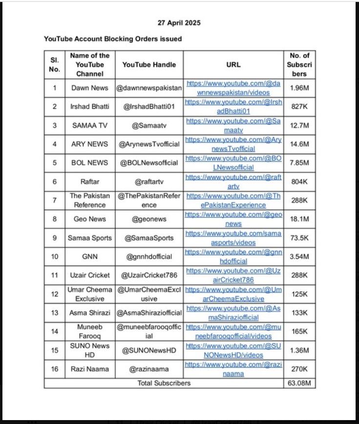 INTERNATIONAL16 big Pakistani YouTube channels banned in India, government also warned BBC