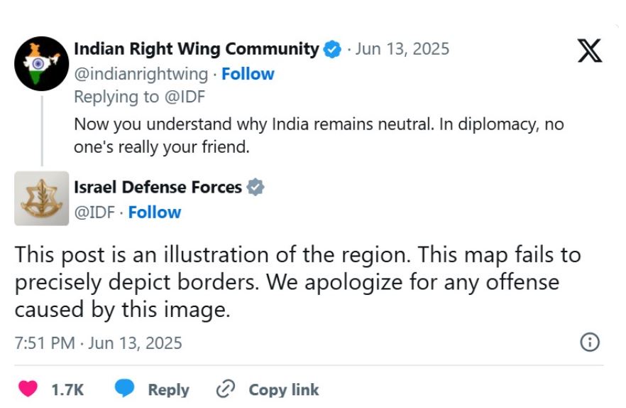 After the IDF post, many Indian users posted angrily and pointed out the IDF’s mistake and asked the Israeli army to take down the post. The Israeli army responded to a post from an X handle called Indian Right Wing Community, saying, “This post is a depiction of the region. There was a mistake in showing the boundaries on the map. We apologize for any offense caused.”