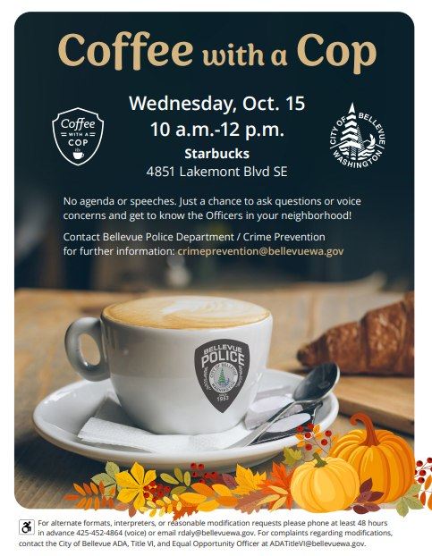 Bellevue, WA — The Bellevue Police Department is inviting community members to a special Halloween-themed edition of Coffee with a Cop this Wednesday, October 15, from 10 a.m. to 12 p.m. at the Starbucks located at 4851 Lakemont Blvd SE.