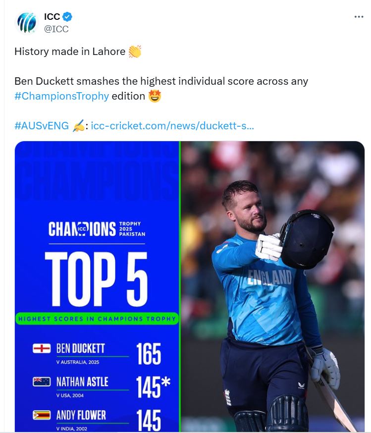 England’s opening batsman Ben Duckett played a brilliant innings against Australia. He scored 165 runs in 143 balls at a strike rate of 115.38. During this, he hit 17 fours and 3 sixes. Along with this, Duckett also captured a special record. He has become the batsman with the highest score in the Champions Trophy.