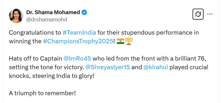 Congress leader Shama Mohammed, who had raised questions on the fitness and captaincy of Team India captain Rohit Sharma, congratulated India on the victory in the Champions Trophy. After the victory, she saluted captain Rohit. She also congratulated KL Rahul and Shreyas Iyer.