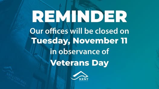 Kent, WA — The City of Kent has announced that several city facilities will be closed on Tuesday, November 11, in observance of Veterans Day.