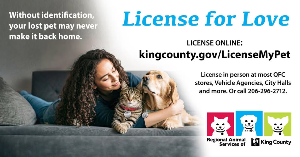 Residents can license their pets online at kingcounty.gov/LicenseMyPet, or in person at participating QFC stores, vehicle licensing agencies, and city halls. Assistance is also available by phone at 206-296-2712.