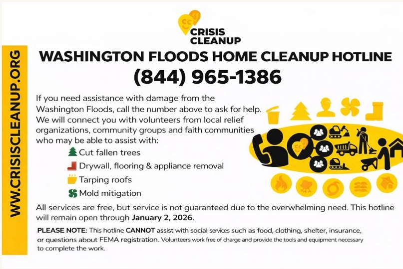 Residents needing help can call the Washington Floods Home Cleanup Hotline at (844) 965-1386 for assistance. Officials encourage impacted residents to reach out as soon as possible due to overwhelming need across the region.