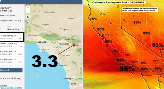 3.3 and 2.8 and 2.7 and 2.6 earthquake foreshocks hit warning area – ALERT ! – Major earthquake is likely in the Los Angeles area today. 04/04/2026. pic.twitter.com/o580Bnw0rx