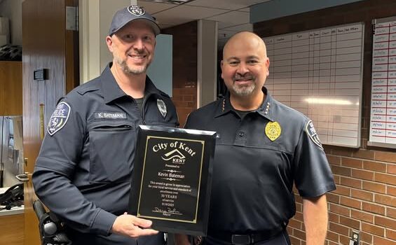 Kent, WA — The Kent Police Department has recognized Traffic Officer Bateman for three decades of dedicated service, presenting him with a 30-year longevity plaque from Chief Padilla.