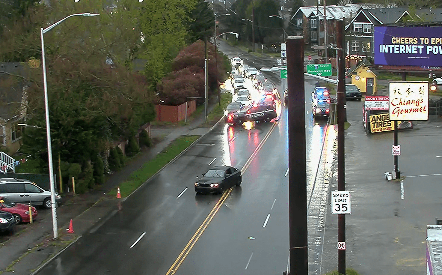 At approximately 7:18 p.m., officers responded to the 7800 block of Lake City Way Northeast after receiving calls about a man waving a handgun at pedestrians. Upon arrival, officers located a black BMW stopped in the roadway, which was later confirmed to be stolen. The suspect was seated in the passenger seat, visibly holding what appeared to be a firearm.