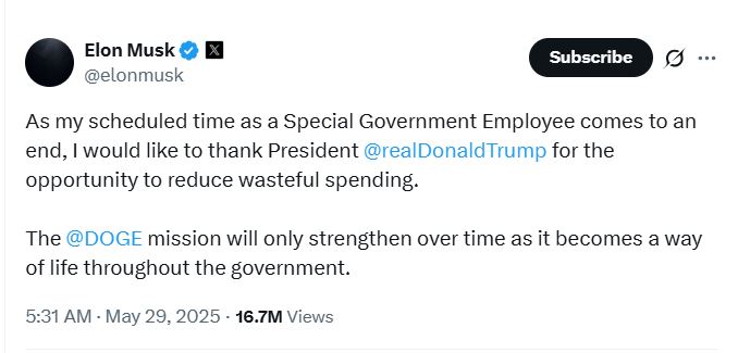 Elon Musk wrote on X: As my term as a special government employee comes to an end, I want to thank President Donald Trump for the opportunity to reduce wasteful spending. The DOGE mission will grow stronger over time as it becomes a way of life throughout the government.