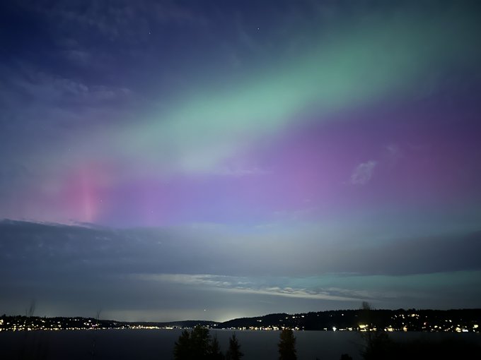 Aurora Borealis as seen from the office roof this evening over Lake Washington! High clouds will continue to increase tonight, but any breaks in the clouds will allow for the northern lights to be visible. #WAwx https://t.co/IUeqS5cZ4T pic.twitter.com/itM8oIJrNL