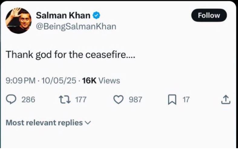 In such a situation, as soon as Salman Khan announced India-Pakistan ceasefire, people’s anger erupted. The ceasefire was announced on May 10 at 5 pm and Sikander star Salman Khan shared a post on his X handle (Twitter) at around 9 pm and said, “Thank God for ceasefire.” As soon as this post was released, people got angry on social media.