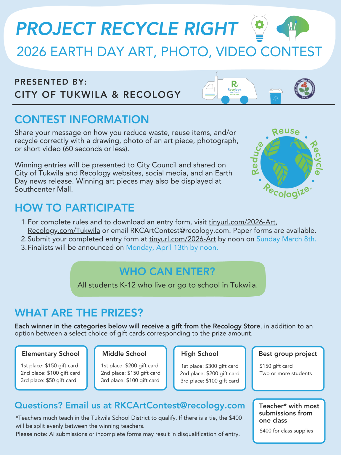Tukwila students are invited to showcase their creativity and environmental awareness through the Project Recycle Right: 2026 Earth Day Art, Photo, and Video Contest, organized in partnership between Recology and the City of Tukwila.