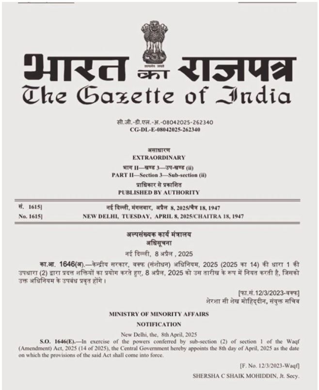 This notification has been published in The Gazette of India. According to the notification issued by the Ministry of Minority Affairs, the Central Government, using the powers conferred by the Constitution, has declared 8 April 2025 as the date under subsection (2) of section 1 of the Act.