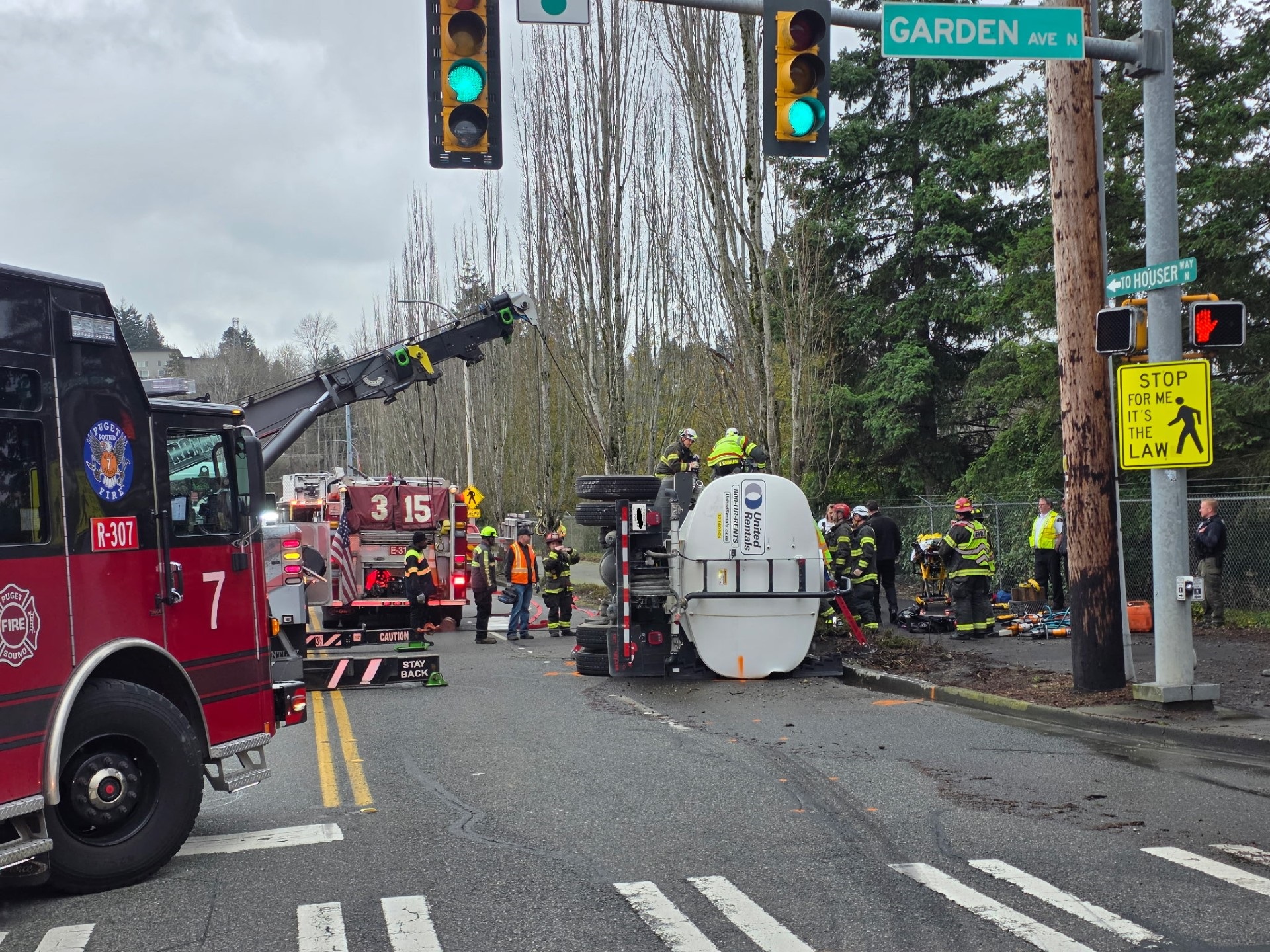 According to the Renton Police Department, officers responded to a rollover crash at the intersection of Garden Avenue North and North 8th Street. Emergency crews arrived at the scene and temporarily rerouted traffic while responders worked to stabilize the overturned vehicle.