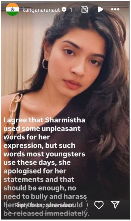 After Sharmistha’s arrest, Kangana Ranaut has given a statement in her support. The actress said in a post on Instagram story, “I agree that Sharmistha used some unpleasant words for her expression, But such words are used by most youths these days, he apologised for his statements and that should be enough, there is no need to threaten and harass him further, he should be released immediately.”