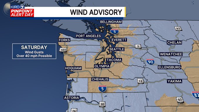 While not expected to be as severe as last weekend’s wind event, gusts of over 40 mph could still cause minor tree damage and isolated power outages across the region. Areas including Seattle, Tacoma, Everett, Olympia, and the Olympic Peninsula are under the advisory.